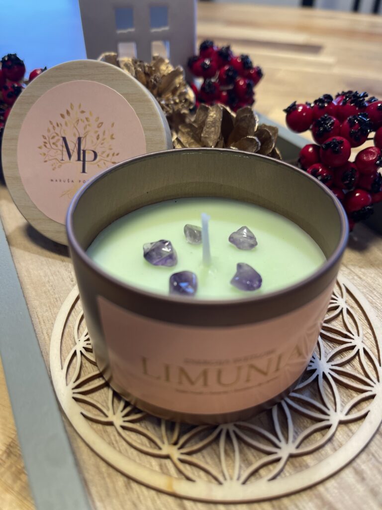 Vsaka energijska svečka Limunia je ročno izdelana iz čistega sojinega voska, obogatena z eteričnim oljem ciprese in kamenčki ametista.